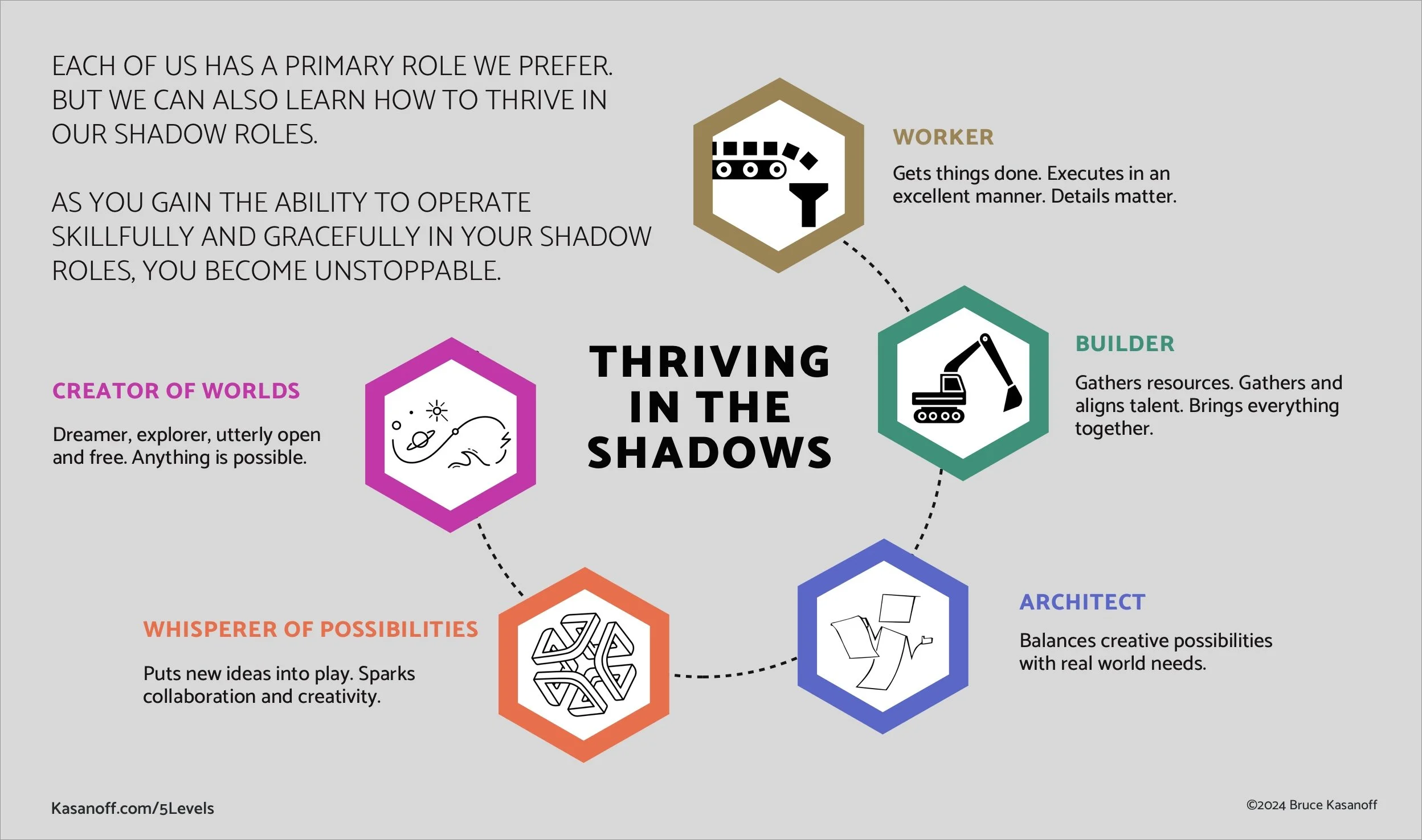Each of us has a primary role we prefer. But we can also learn to thrive in our shadow roles. As you gain the ability to operate skillfully and gracefully in your shadow roles, you become unstoppable.
